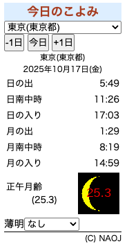 サイト内「今日のこよみ」や「こよみの計算(CGI版)」のページで、都道府県や市区町村を選択すれば、日ごとの日出・日没時刻を簡単に調べられます。